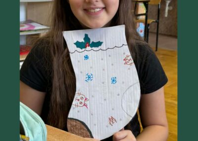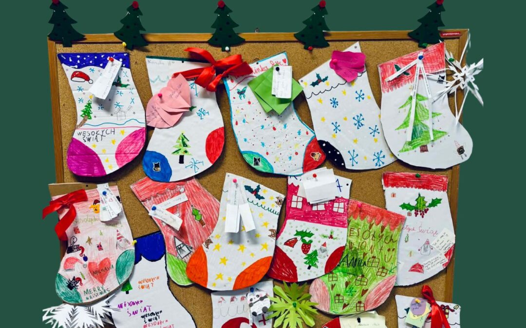 W grudniu rodzice przygotowują dla swoich dzieci krótkie, wzmacniające słowa – pochwałę, życzliwe zdanie, pozytywną myśl. Uczniowie przynoszą i przypinają karteczki tuż przed lekcjami. Jeśli takie tempo się utrzyma, wkrótce będziemy potrzebowali większych modeli! Skarpety powoli zaczynają „puchnąć” od dobra!