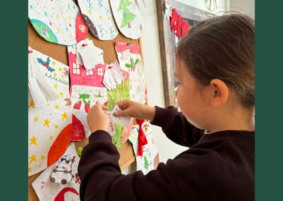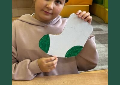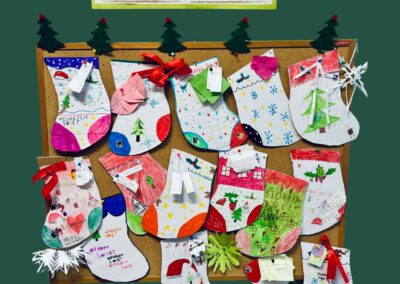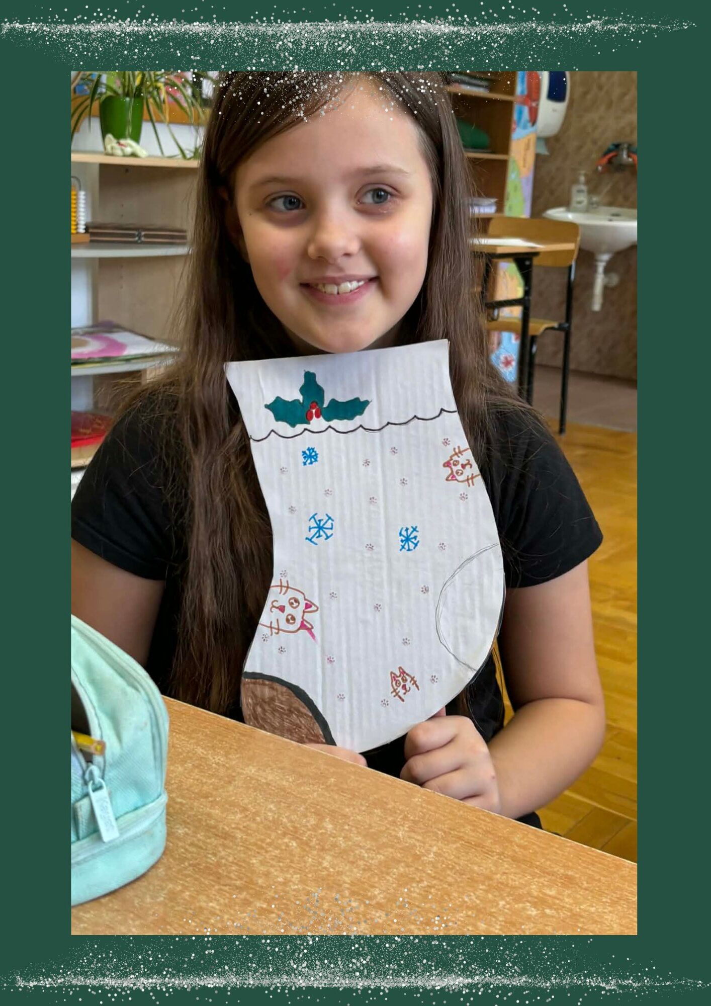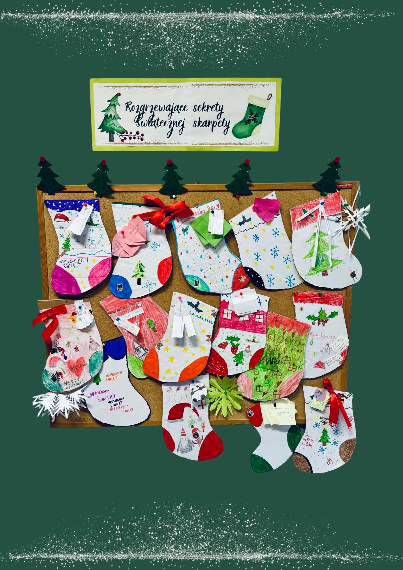 W naszej szkole, w kilku urokliwych, „Skarpetkowych Zakątkach”, zawisły świąteczne ozdoby – tekturowe „przechowalnie dobrego słowa”. Każde dziecko samodzielnie ozdobiło swoją, a wszystkie razem tworzą piękne dekoracje w poszczególnych salach.